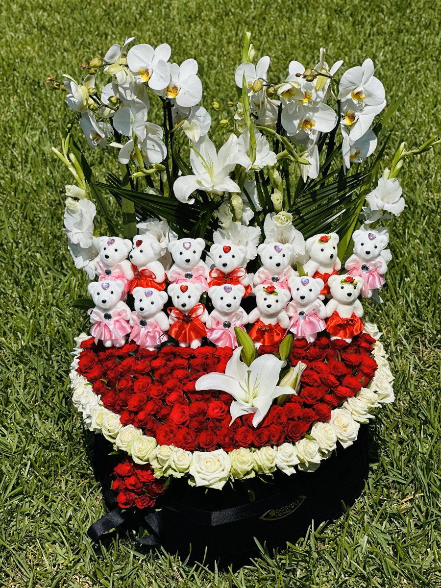 Şefkatli Dokunuş (Peluş Ayıcıklar): Kırmızı güllerin üzerine özenle yerleştirilen Beyaz Peluş Ayıcıklar, bu ağır ve asil tasarıma şirin, yüz güldüren ve kalıcı bir hatıra ekler.