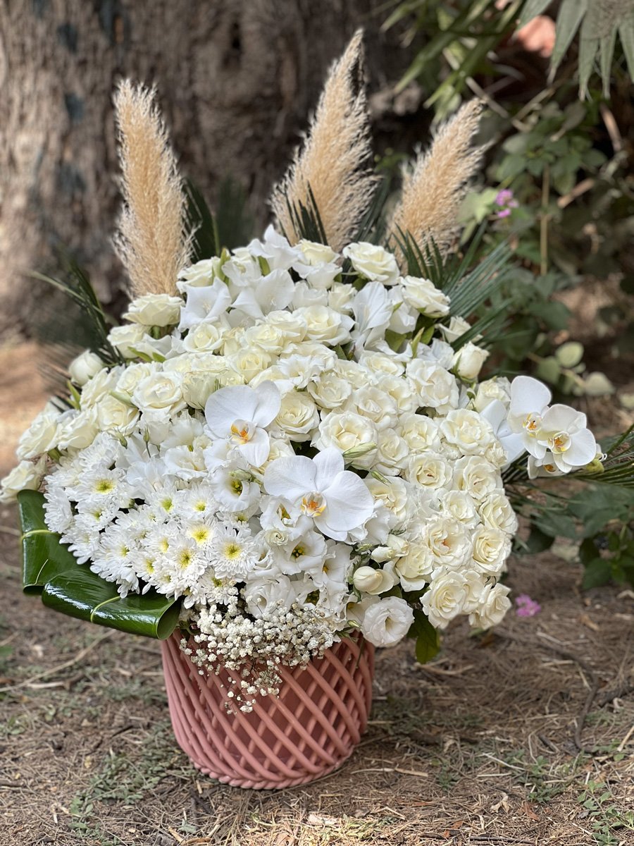 Masumiyetin Gösterişli ve Hacimli Hali Beyaz renk; temizliği, yeni başlangıçları ve iyi niyeti temsil eder. Bu aranjman, tamamen beyaz çiçeklerin farklı dokularını bir araya getirerek (güllerin kadifemsi yapısı, orkidelerin zarafeti, krizantemlerin hareketliliği) göz yormayan ama inanılmaz derecede zengin ve hacimli bir “Kraliyet” duruşu sergiler.