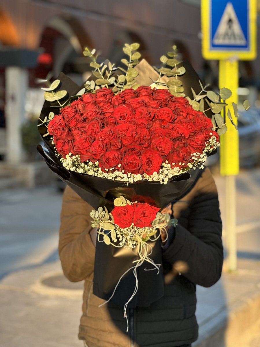 Okaliptüs ve Tasarım Detayları Buketi tekdüzelikten kurtaran en önemli detay, güllerin arasından özgürce yükselen Taze Okaliptüs Dallarıdır. Okaliptüs, tasarımı günümüz modern çiçekçilik trendlerine taşırken, alt kısımdaki beyaz cipso (milyon yıldız) çiçekleri kırmızının o yoğunluğunu zarafetle dengeler. Buketin sap kısmına eklenen canlı gül süslemesi ise, hediyenizin her bir milimetresinin özenle tasarlandığını gösterir.