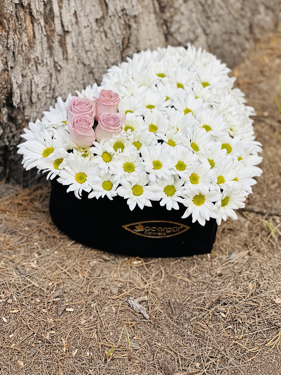 Güllerin sayısı (4 adet) tasarımı boğmadan, papatyaların doğallığını gölgelemeden mükemmel bir denge sağlar. Kalp kutunun formuyla birleşince, hem romantik hem de modern bir hediye ortaya çıkar.