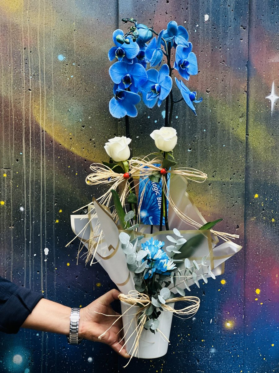 Adana mavi orkide siparişi, beyaz seramik saksı içerisinde iki adet beyaz gül, okaliptüs ve mavi krizantemlerle süslenmiş lüks mavi orkide aranjmanı.